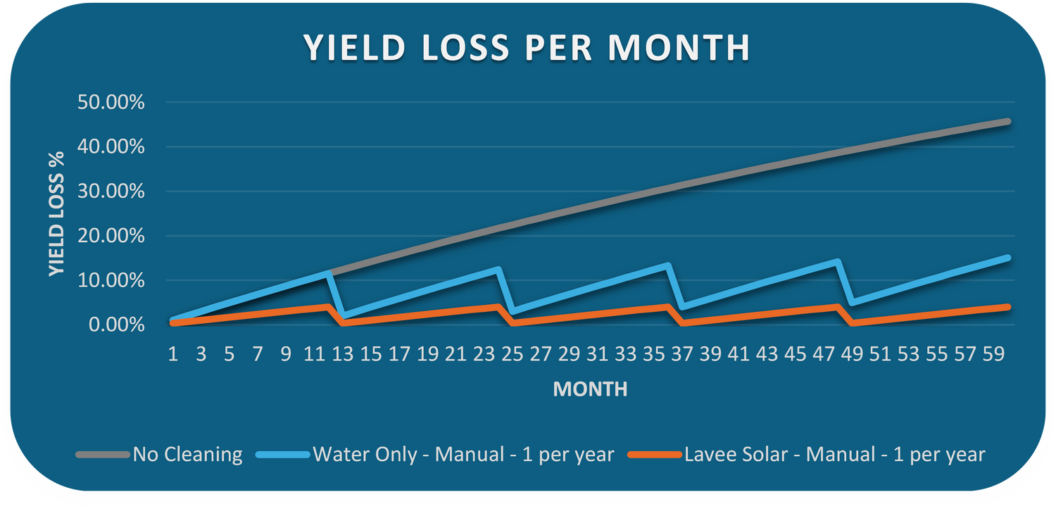 Scenario 3 - Lavee Solar (orange line) - After cleaning, SmartShield protects the panels meaning that soiling build up is much slower. Panels cleaned with Lavee Solar stay cleaner for longer, minimising soiling losses.