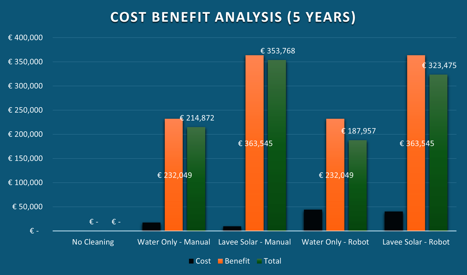 The Cost-Benefit of each cleaning method below was assessed over a 5-year period, with all associated costs considered: